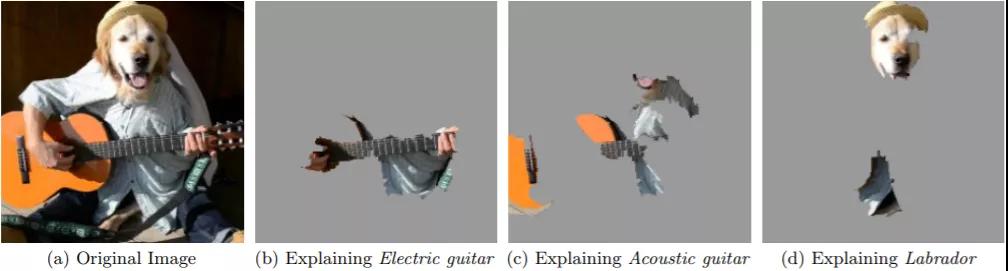 ▲图2-2 事后解释:a. 原始图片,b. 解释为电吉他的原因,c. 解释为木吉他的原因,d. 解释为拉布拉多的原因(来源:论文“"Why Should I Trust You?"—Explaining the Predictions of Any Classifier”)