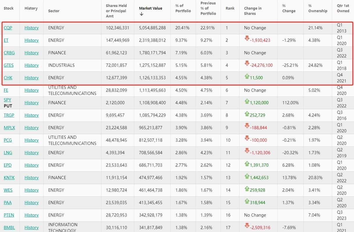 切萨皮克能源(CHK.US)位列第五,持仓约1268万股,持仓市值约11.3亿美元,占投资组合比例为4.55%,较上季度持仓数量增加0.09%。