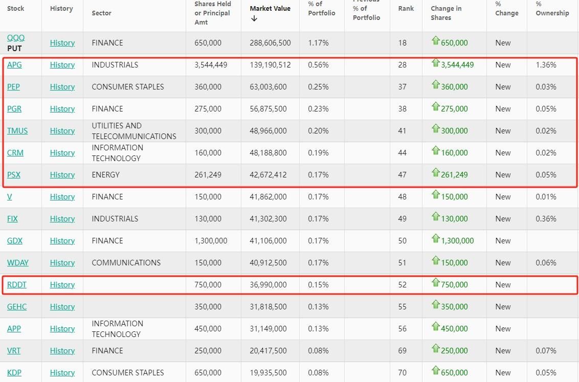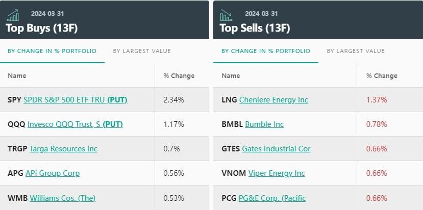 从持仓比例变化来看,黑石第一季度的前五大买入标的分别是:SPDR标普500指数ETF看跌期权(SPY.US,PUT)、Invesco纳指100ETF看跌期权(QQQ.US,PUT)、Targa Resources(TRGP.US)、APi Group(APG.US)、威廉姆斯(WMB.US)。