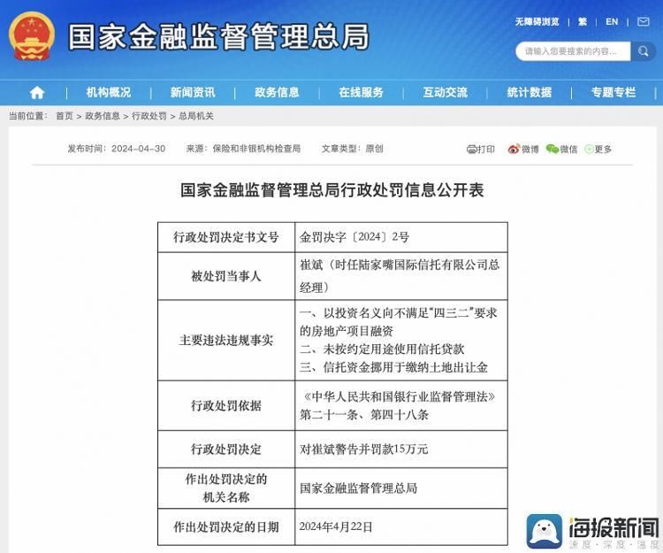 4月30日,国家金融监督管理总局披露的行政处罚信息公开表显示,陆家嘴信托因报送监管部门的报告报表不真实、关联方和关联交易数据不真实、以投资名义向不满足“四三二”要求的房地产项目融资、未按约定用途使用信托贷款、信托资金挪用于缴纳土地出让金、信托产品信息披露不审慎、违规接受保险资金投资事务管理类信托计划七项违法违规事实被处以420万元罚单。
