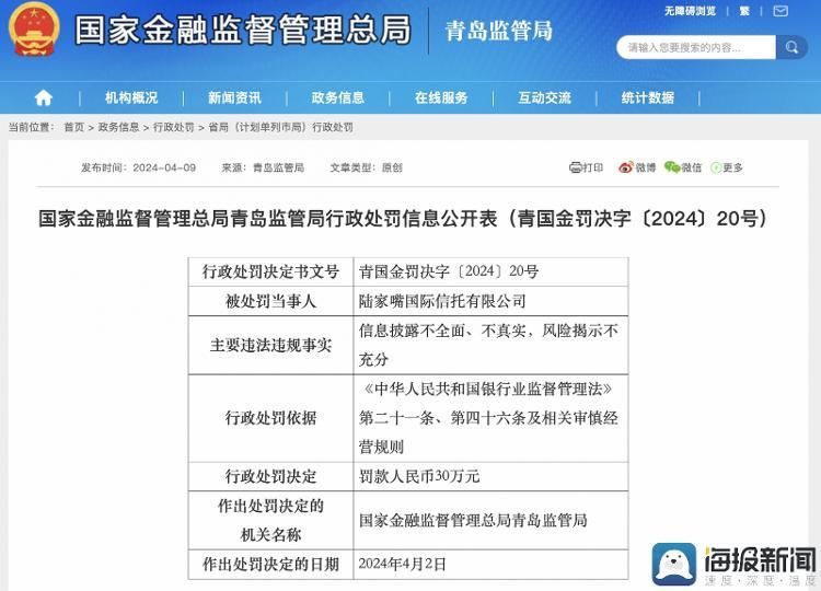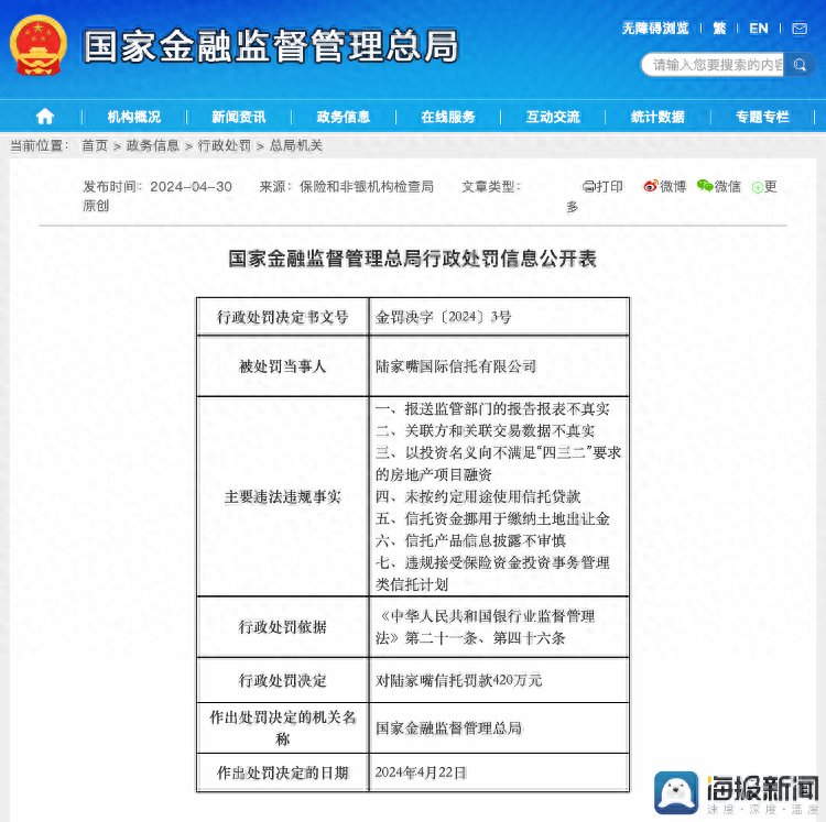 昌隆投资 海量财经丨陆家嘴信托被罚420万 4月初刚被罚了30万
